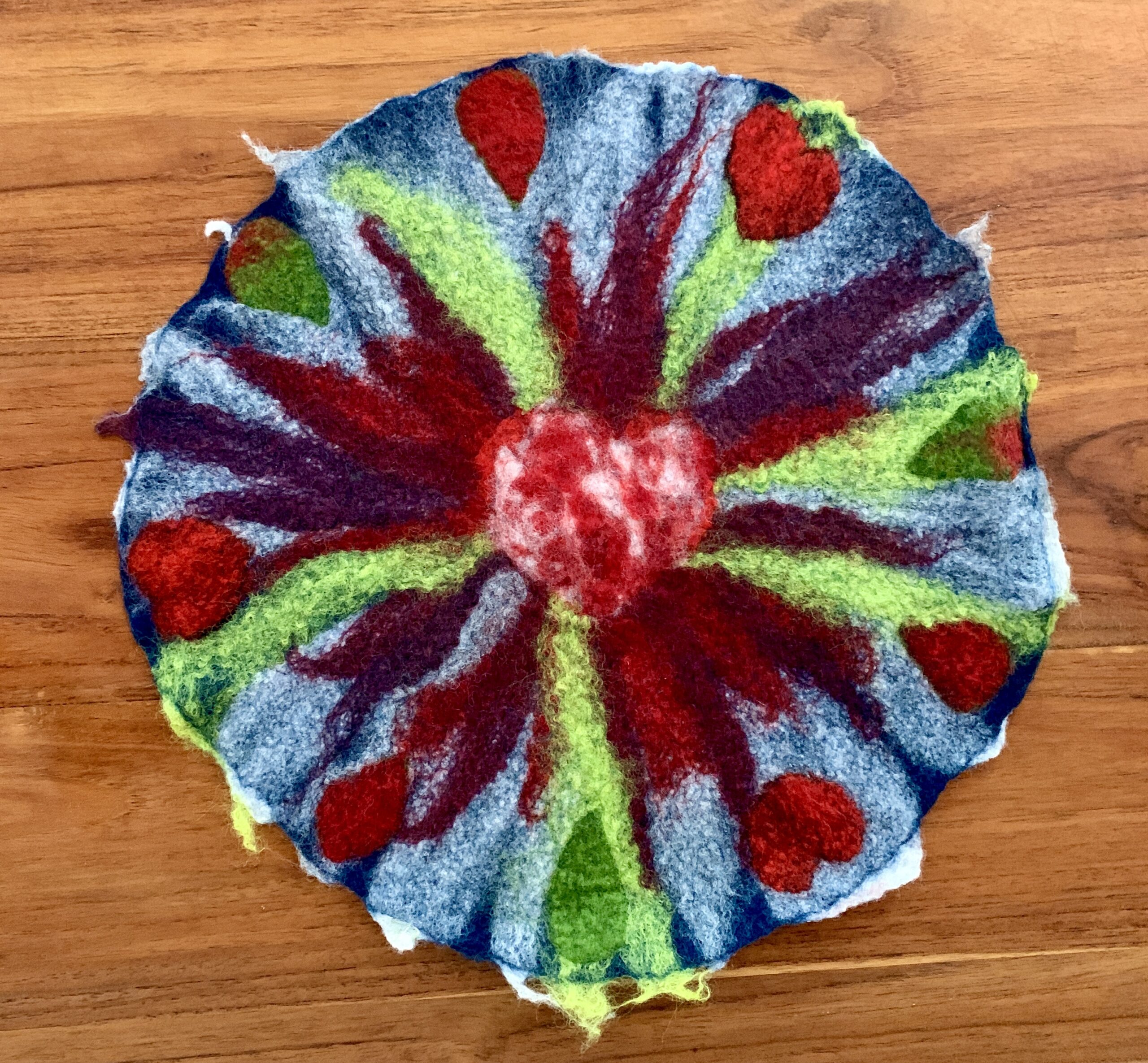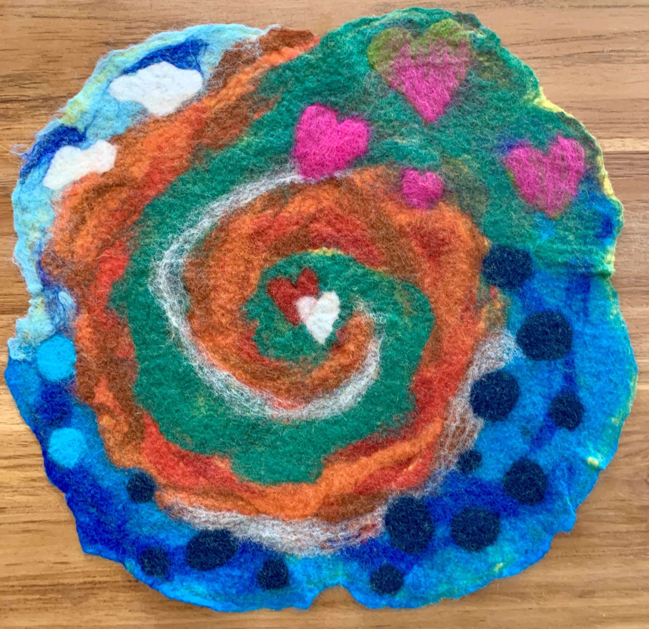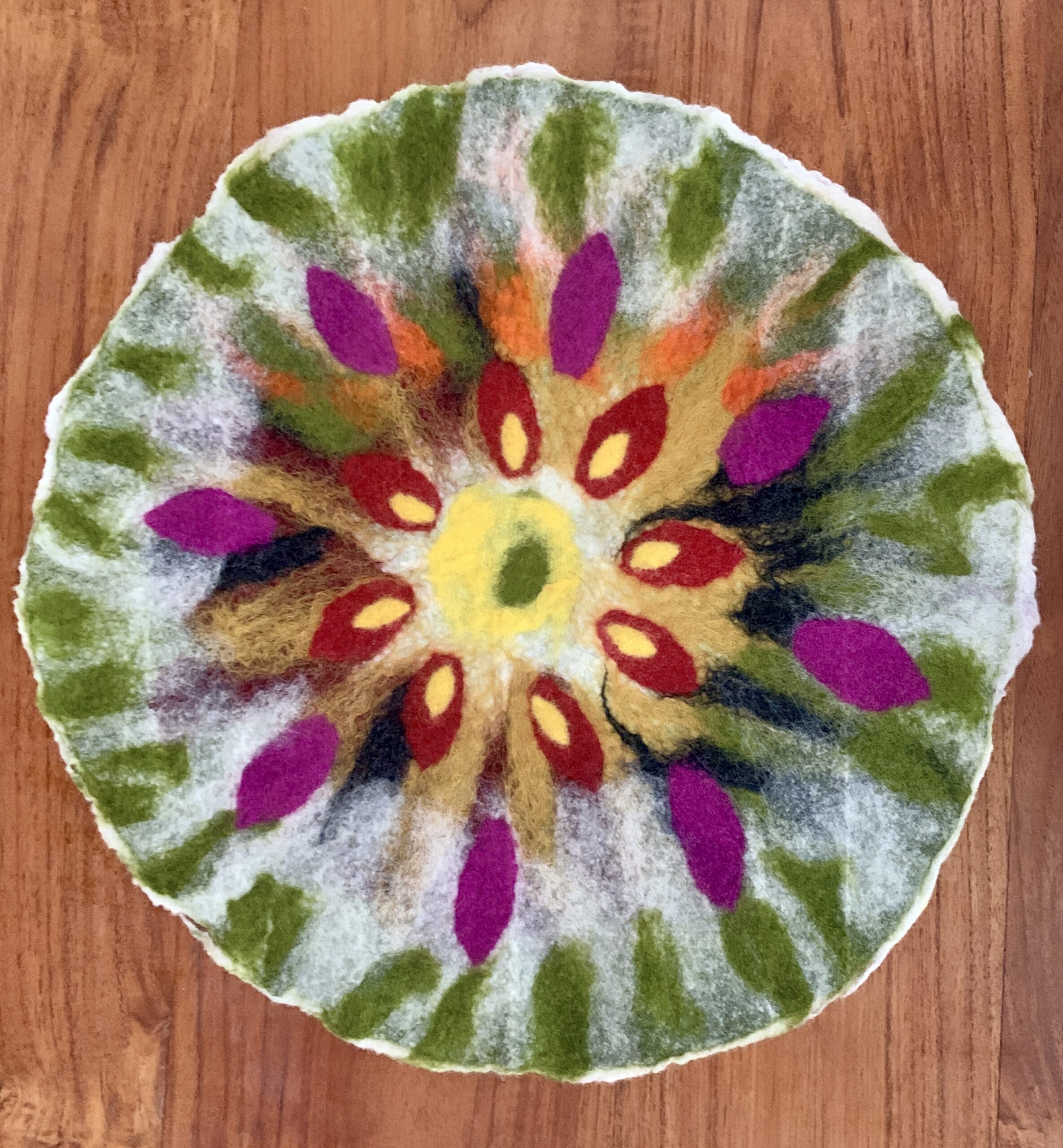 In een kleine groep kan je onder begeleiding van een kunstenaar met allerlei prachtige natuurlijke materialen een mandala vilten. Je ondekt dat alles kan en goed is en je kan inspireren tot een eigen vorm. Het vrije spel bevrijd je van technieken en regels, zoals deze foto waar een mandala zomaar helemaal niet rond werd.